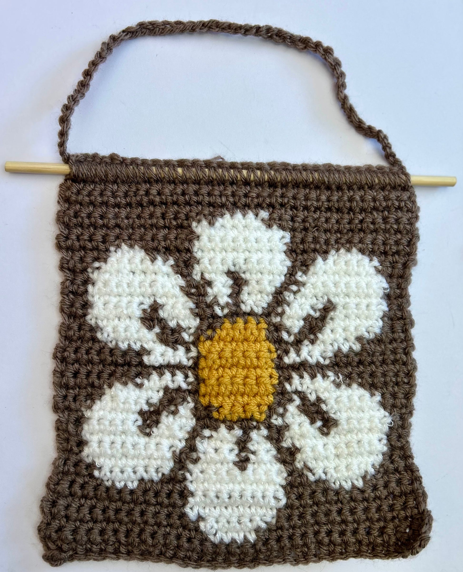 This handmade crochet tapestry brings timeless elegance to any space with its intricate daisy motif set against a warm brown backdrop. Each flower is carefully crafted, showcasing the delicate beauty of the petals and adding a touch of natural charm. The rich brown background provides a soothing and earthy contrast, allowing the white and yellow daisies to pop and become a focal point in your room.