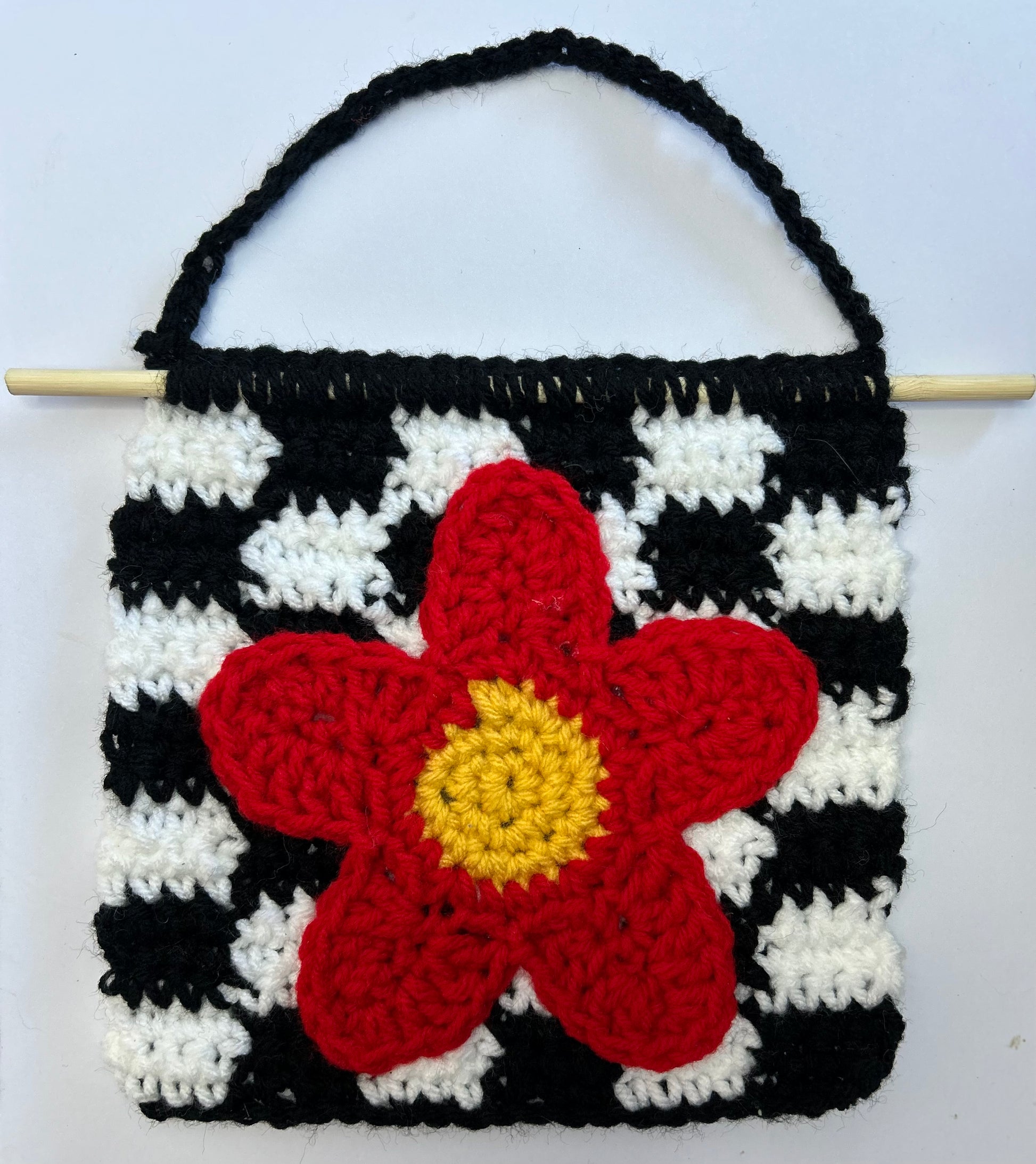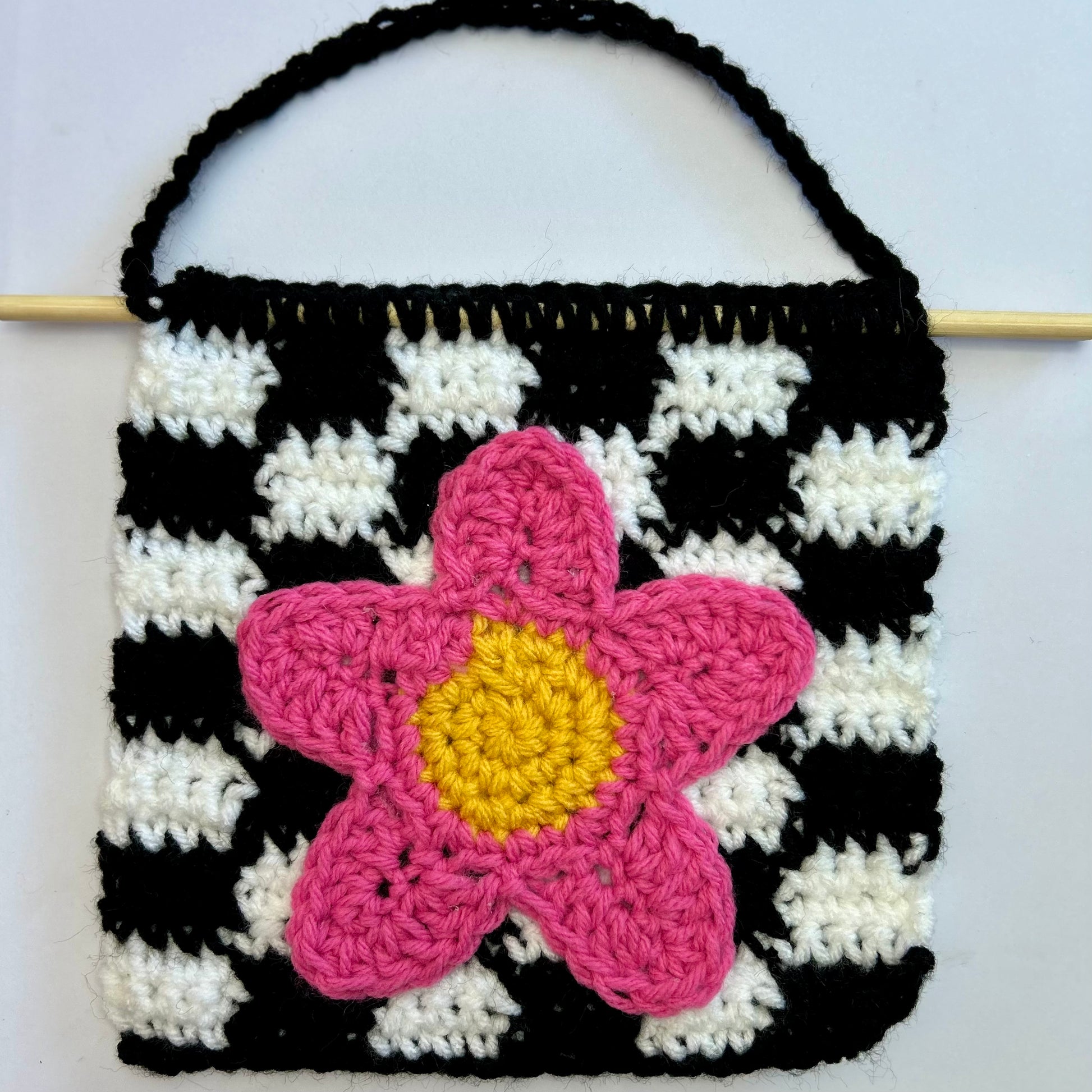 This stunning crochet floral tapestry is a perfect blend of bold patterns and vibrant blooms. Featuring either a striking black and white checkered background or a playful cow print in black, it sets the stage for beautifully detailed crochet flowers. The flowers themselves come in shades of red, pink, or blue, each with a cheerful yellow center that pops against the contrasting backdrop. Handcrafted with care, this tapestry adds a touch of artistic flair and texture to any room, making it a unique statement piece for your home or office. Whether you choose the classic checkered design or the fun cow print, this tapestry is sure to bring a lively, eye-catching charm to your space.