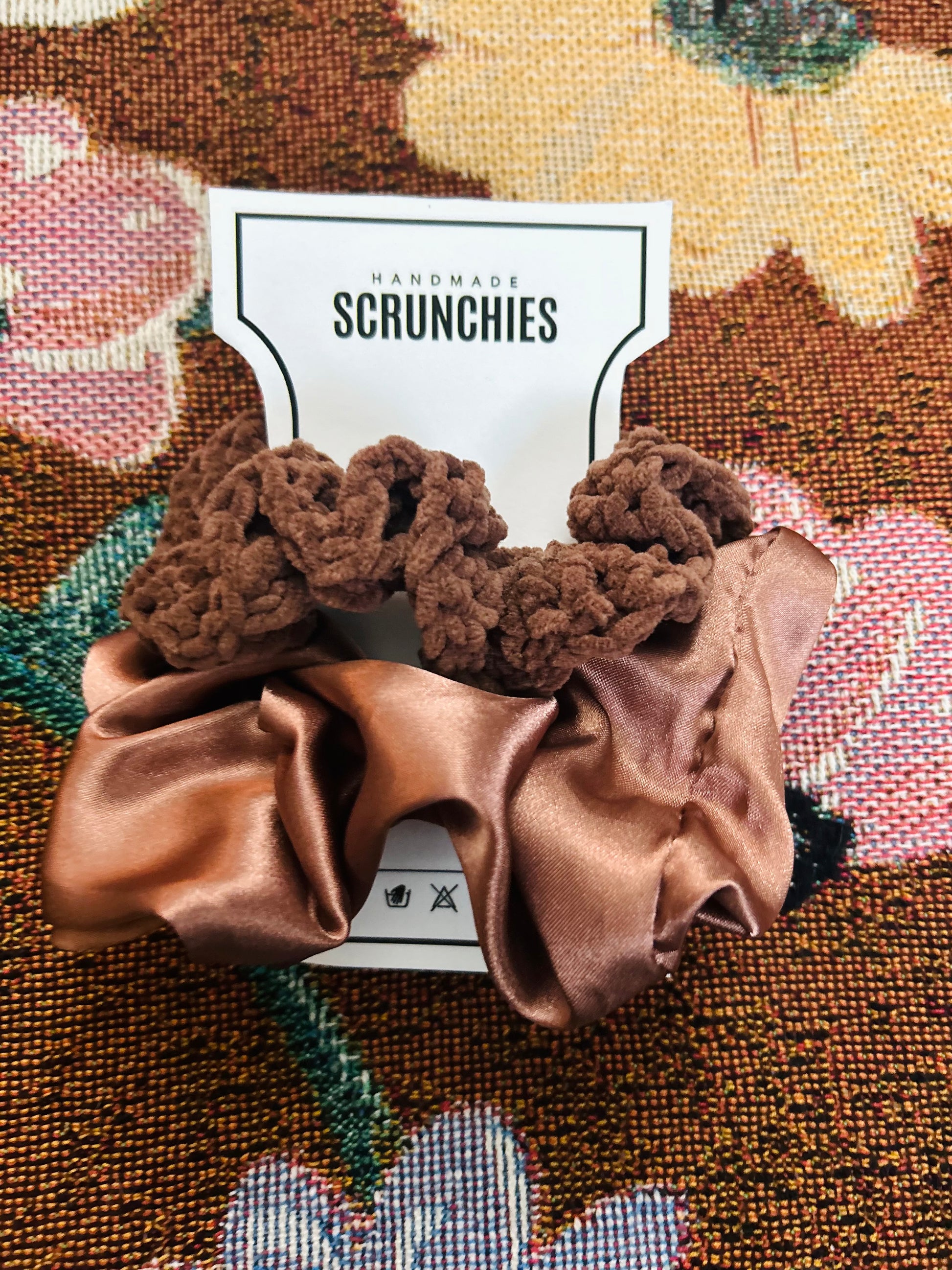 Earthy and warm, this set features a rich brown crochet scrunchie complemented by a glossy mocha satin scrunchie. A great accessory for neutral-toned outfits or fall-inspired looks.